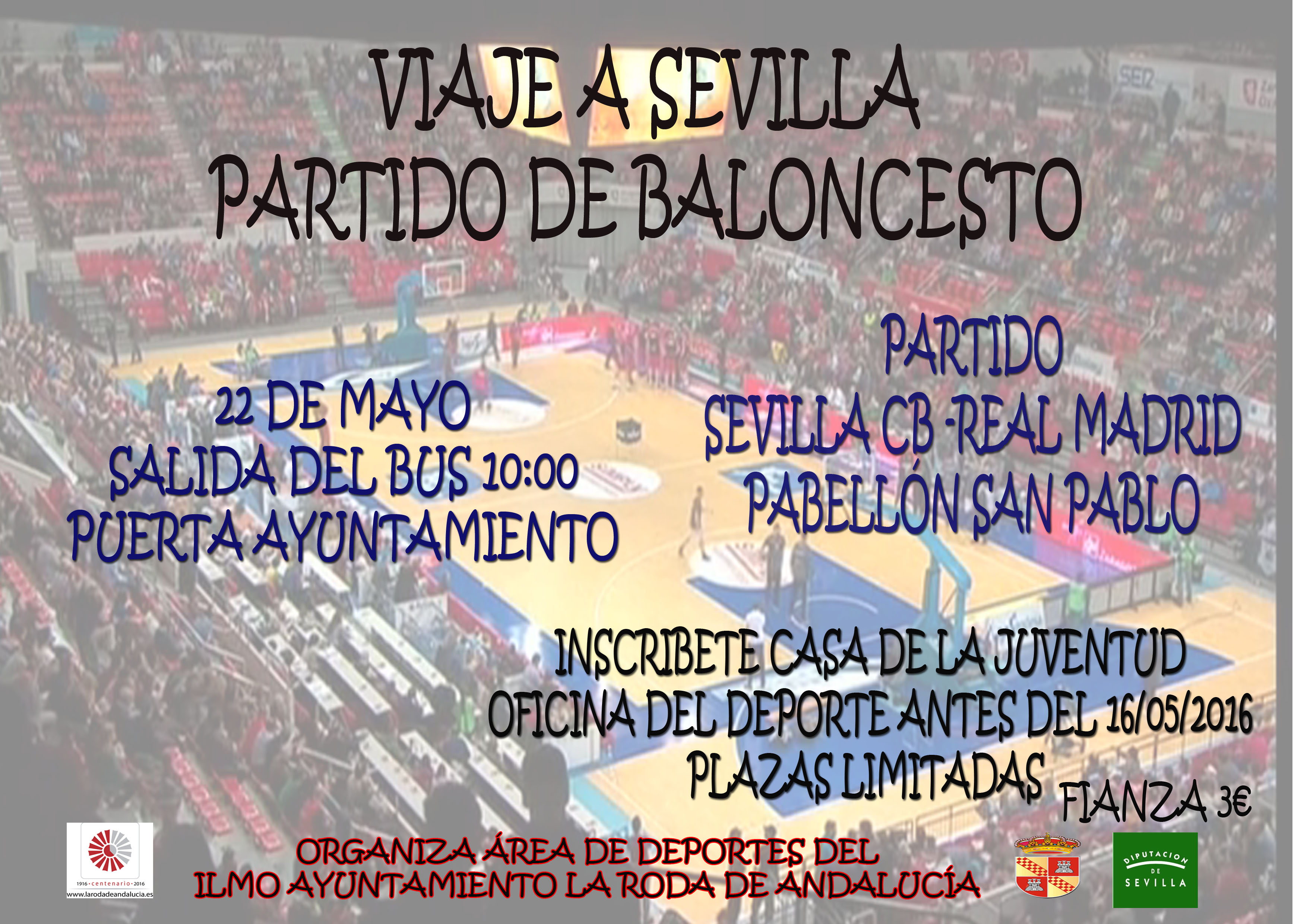 Viaje a Sevilla para disfrutar del partido de Baloncesto entre el Sevilla CB y el Real Madrid el próximo domingo 22 de mayo en el Pabellón San Pablo. La salida se realizará desde la puerta del Ayuntamiento de La Roda de Andalucía a las 10:00 horas. Para más información e inscripciones dirigirse a la Casa de la Juventud, Oficina del Deporte.