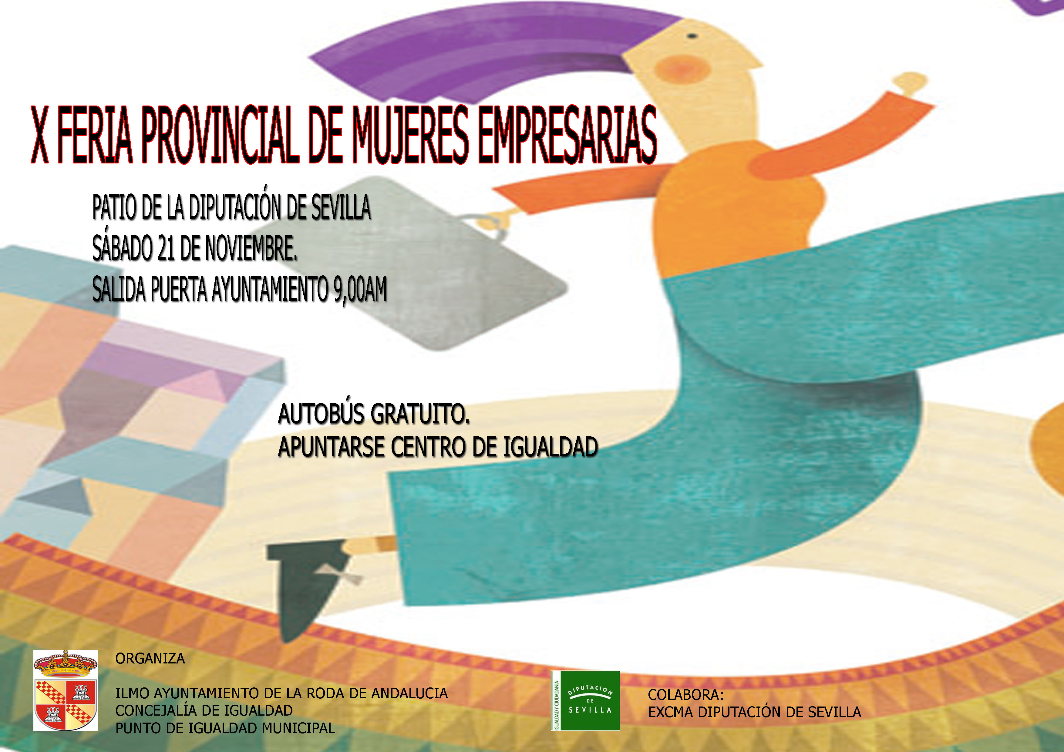 Viaje a la X Feria de Empresarias que se celebra en el Patio de la Diputación Provincial de Sevilla el sábado día 21 de noviembre. La salida será desde la puerta del Ayuntamiento de La Roda de Andalucía. El autobús es gratuito. Apuntarse en el Centro de Igualdad de La Roda de Andalucía.