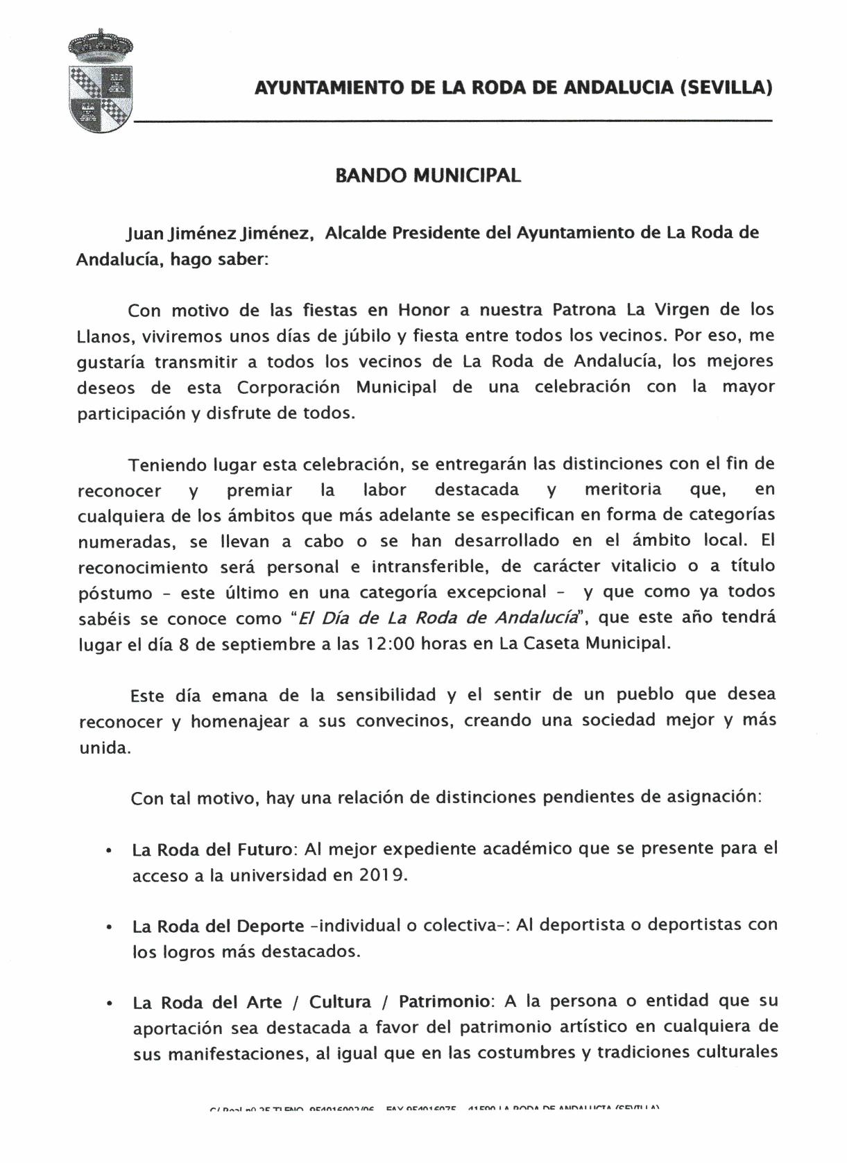 Bando Municipal por las fiestas en honor a nuestra Patrona la Virgen de Los Llanos, además os dejamos la Nota Informativa para la concesión de reconocimientos en la celebración del Día de La Roda de Andalucía que este año se celebrará el domingo 8 de septiembre a las 12:00 horas en la Caseta Municipal. Al final de esta Nota Informativa se adjunta el modelo para la presentación de candidaturas. El plazo para presentar las candidaturas finaliza el 23 de agosto a las 14:00 horas.
