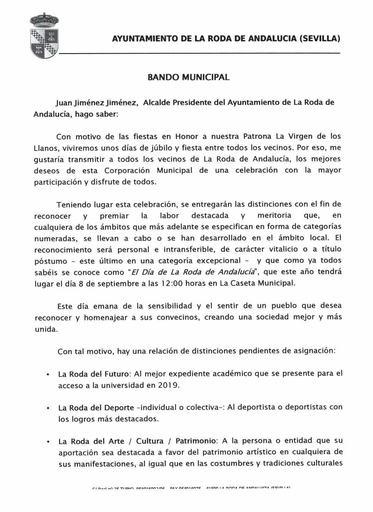 Bando Municipal sobre las Fiestas en Honor a la Virgen de Los Llanos